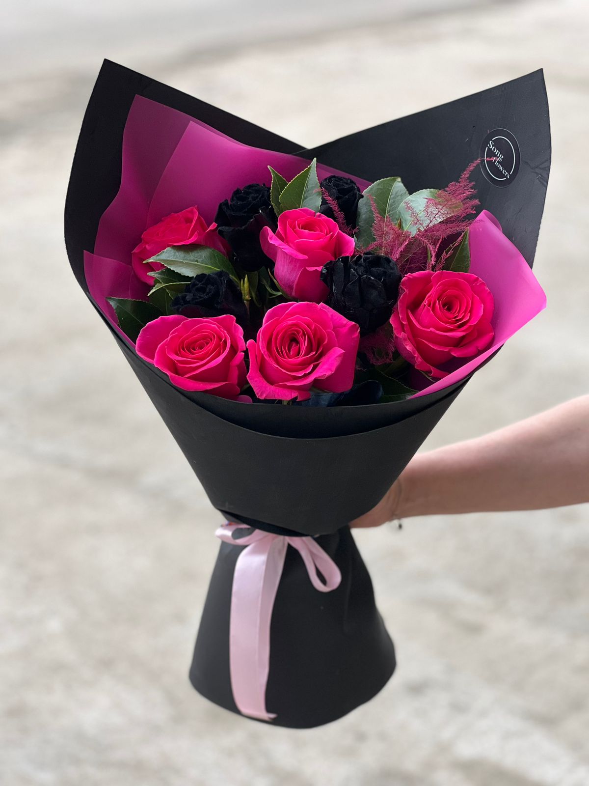 ეს ბუკეტი აერთიანებს კაშკაშა ვარდისფერ და ღრმა შავ ვარდებს, შეფუთულია ელეგანტურ შავ პაკეტში ცხელი ვარდისფერი ჩანართით და რბილი ვარდისფერი ლენტით. ფერების კონტრასტი თაიგულს დრამატულობასა და თანამედროვეობას მატებს.