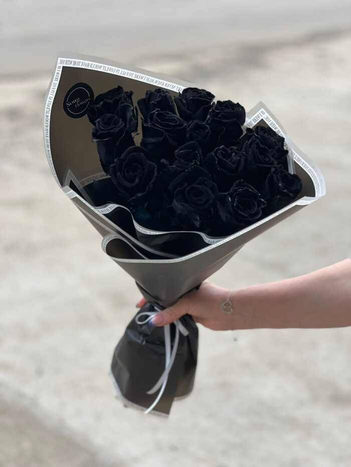 ელეგანტურ შეფუთვაში შეფუთული შავი ვარდები ვერცხლისფერი აქცენტებით და თეთრი ლენტით ქმნის იდუმალ და დახვეწილ იერს. ბუკეტი გამოხატავს ღრმა გრძნობებს და შესაფერისია განსაკუთრებული შემთხვევებისთვის.
